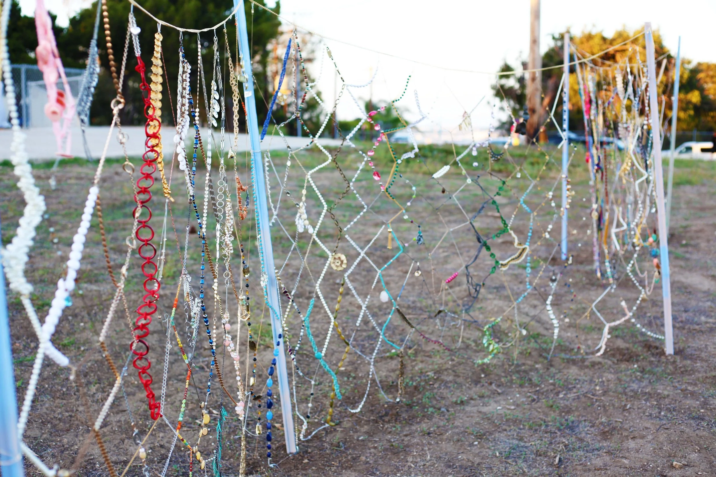 Necklace/Net is a collection of intuitively laced necklaces formed in the likeness of a fishing net. I’m constructing this sparkling net from anonymous jewelry bought in bulk mystery hauls online. Other pieces were spontaneously found, handed down, or sentimentally kept. This is a personal sculpture inspired by three generations of women in my family keeping seashells in their jewelry boxes. It’s also inspired by the Buddhist cosmological metaphor of Indra’s Net-- an image that proposes that consciousness itself is an immense net with a jewel at every intersection representing each individual. Finally, it is influenced by the mentality of disaster prepping, survival books, fishing lures, and emotional entanglement.